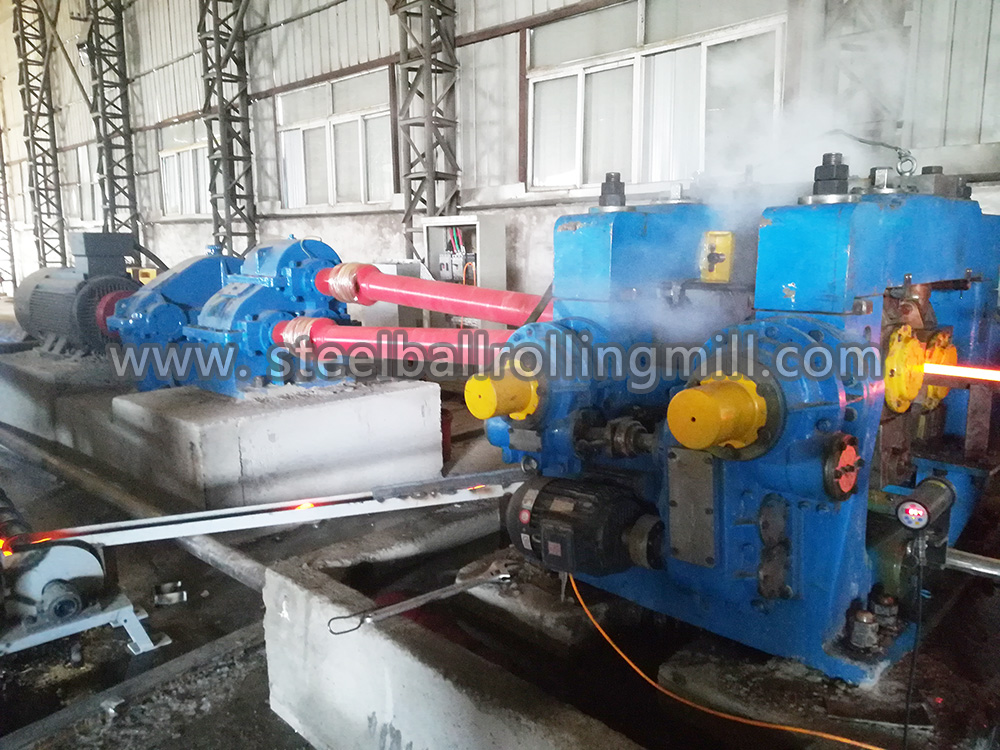 軋輥軸線與軋制線傾斜一定角度。軋輥上有螺旋孔型。軋件螺旋前進(jìn)。在螺旋孔型作用下,圓鋼逐漸變成球形,球形間連接頸部分越來越細(xì),最后斷開而獲得鋼球。軋后的鋼球經(jīng)過進(jìn)一步熱處理后即得到成品鋼球。