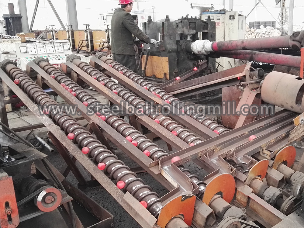 3、紅熱態的鋼坯被送入鋼球軋機后,在2個帶有特殊螺旋形孔型的軋輥之間旋轉前進,并被連續地軋制成鋼球。每臺鋼球軋機每分鐘可軋成30~200個鋼球。